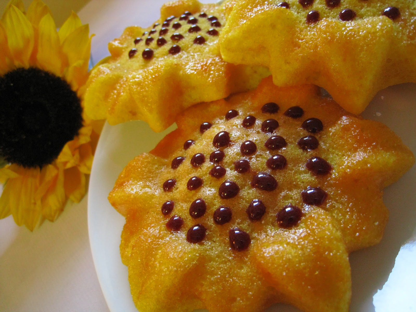 180С-20 минут.Вынуть кексики на решетку,остудить. Корнетик заполнить смородиновым желе и выдавить точечки по центру цветка.Мне кажется.что любой малыш с радостью будет уплетать такой веселый подсолнух!