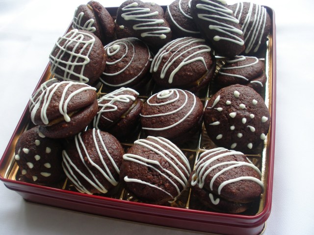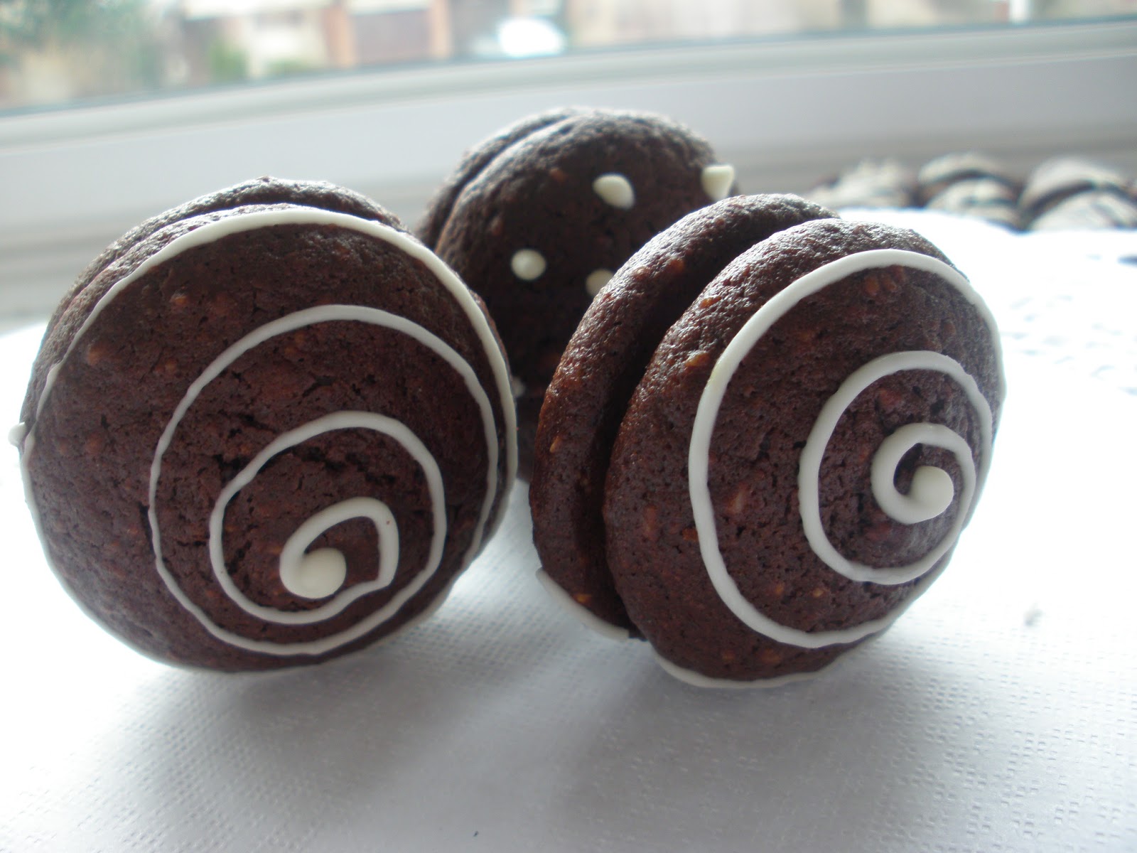 Берем миксер,он быстро поможет смешать все ингридиенты.Взбиваем яйца и сахар,добавляем шокоягодную начинку,майонез,какао,миндальную крошку,ваниль.Просеять пол-стакана муки и разрыхлитель.Теперь,орудуем ложкой.Подсыпаем муку постепенно до тех пор,пока тесто станет по консистенции,как густая сметана.Муки может уйти и пол-стакана.Приготовить противень,выстелить пекарской бумагой.Если нет кондитерского мешка с насадкой,нужно взять пустую пластиковую бутылку(500 мл),срезать горлышко с плечиками и вставить в п/э пакет,предварительно,срезав уголок на пакете.Получается замечательный кондитерский мешок с насадкой нужного диаметра.При выпечке таких печенек-бомбочек я использую это приспособление.Поместить массу в мешок и отсадить кругляшки,диам.2,5- 3 см на расстоянии друг от друга(они вырастут).Печь при 180С около 10-15 минут(следите).Выложить на решетку и остывшие половинки склеить вареным сгущеным молоком.Верх украсить растопленым белым шоколадом.Фантазируйте!!!