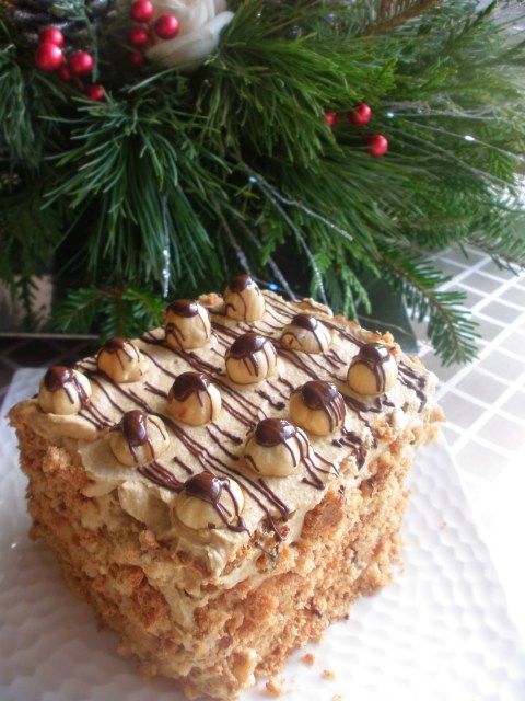 Выкладываем на блюдо 1 корж, который не смазан с одной стороны, шоколадом вверх. Наносим крем, затем положить второй корж, нанести крем и так далее…