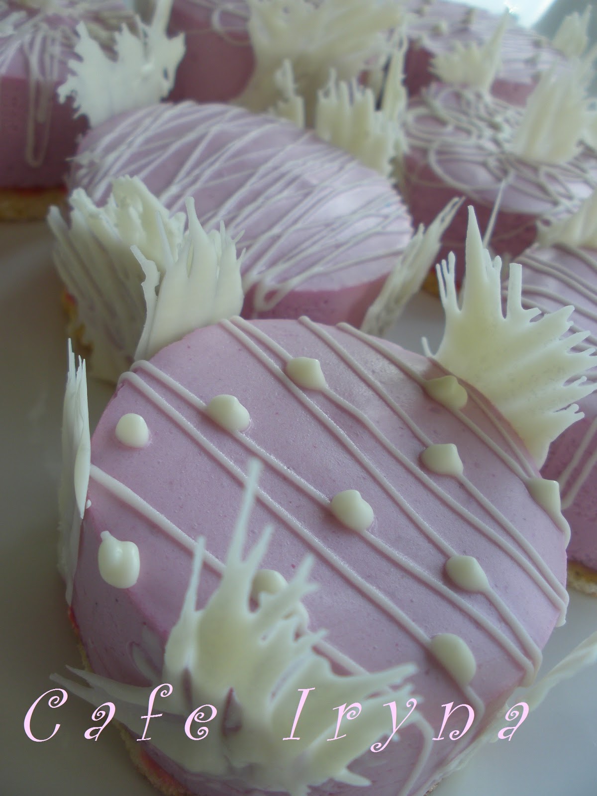 Выемкой вырубить круглые основания для пирожных,тонко смазать джемом из смородины.Обернуть каждое основание ацетатной пленкой,закрепить.Выложить на каждый кружок,третью часть чайной ложки сгущеного молока и по 3-4 ягодки смородины.Залить сверху смородиновым муссом.Поставить в холодильник на 1 час.Растопить на водяной бане шоколад.На фрольгу выложить ложкой порции шоколада и вилкой сделать «перышки».Убрать в холодильник.Вынуть пирожные и шоколад,украсить бока «перышками.а верх- из корнетика.