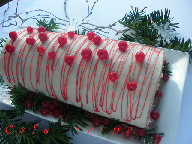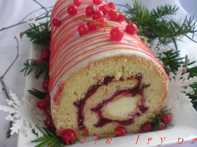 Прогреть сливки до горячего,поломать туда белый шоколад и перемешать до растворения.Вынуть рулет,обрезать края,покрыть белым ганашем.Когда верх схватится,на водяной бане растопить красный шоколад и из корнетика нанести тонкие линии,выложить красную смородину.