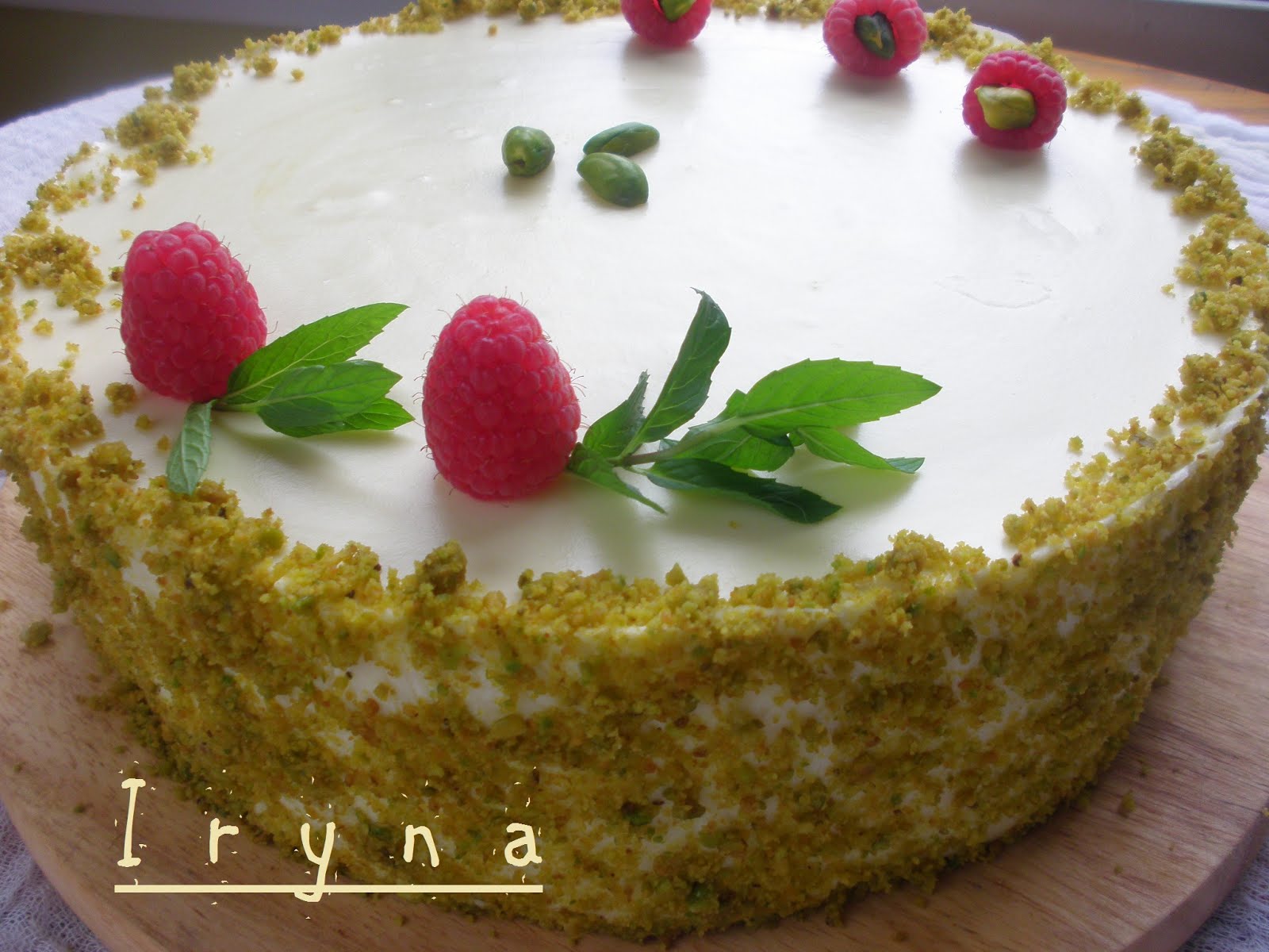 Украсить фисташковой крошкой,малиной и мятой