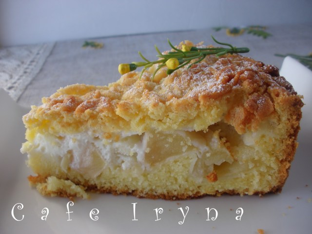 Сладкое тесто,а в середке-кислые яблоки и несладкое безе.