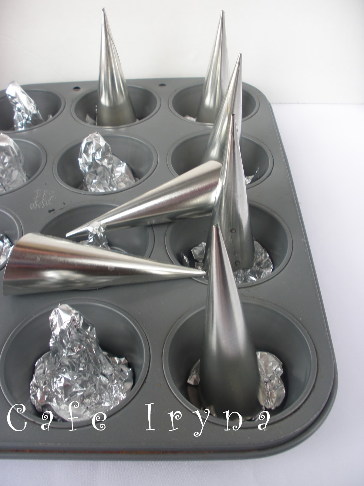 Изготовить из фольги основания,но которые будут одеваться конусы с тесто
