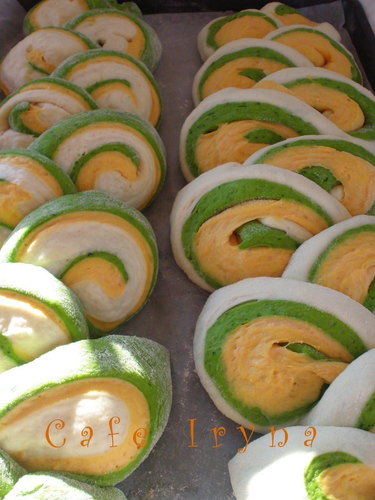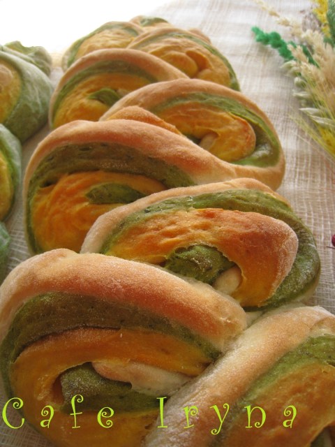 И снова овощной хлеб,трехцветный.Испробовала новую форму и мне больше понравилось.Можно просто отламывать,как порционную булочку.
