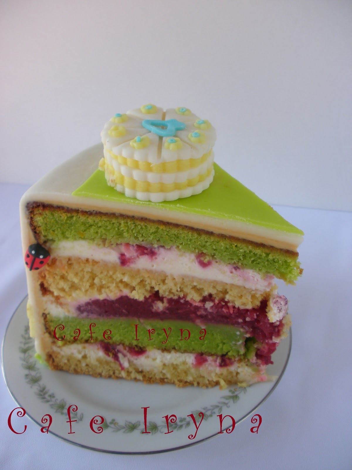 На день рождения с гостями изготовила торт под мастикой.Добавила кокосовый бисквит и клубничное желе,к зеленому бисквиту-ароматную цедру апельсина.