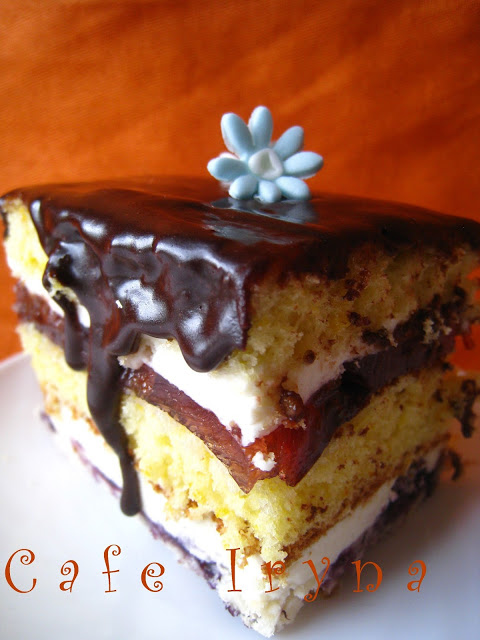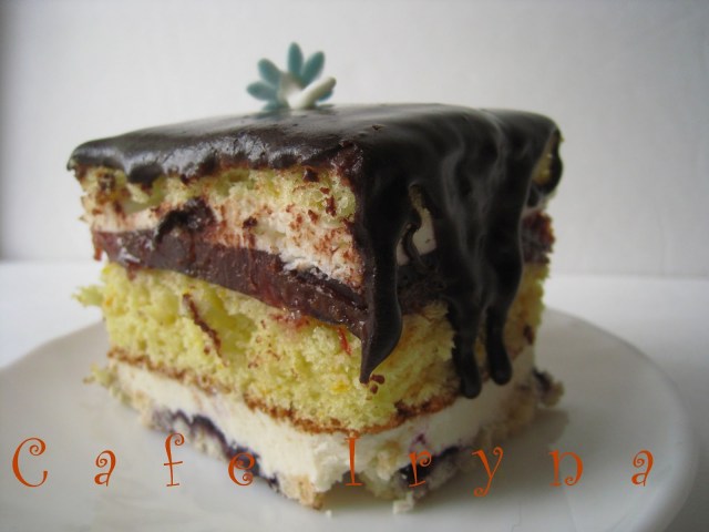 Воздушный апельсиновый бисквит лежит на хрупкой песочной основе,два вида крема,сливовое желе,много сока и цедры ну и все это -залито толстым слоем шокоглазури.