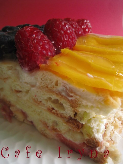 Коржи -ввиде сетки из заварного теста,в ячейки выкладываются кусочки фруктов и  ягод,все это переслаивается нежным заварным кремом и получается воздушное великолепие…