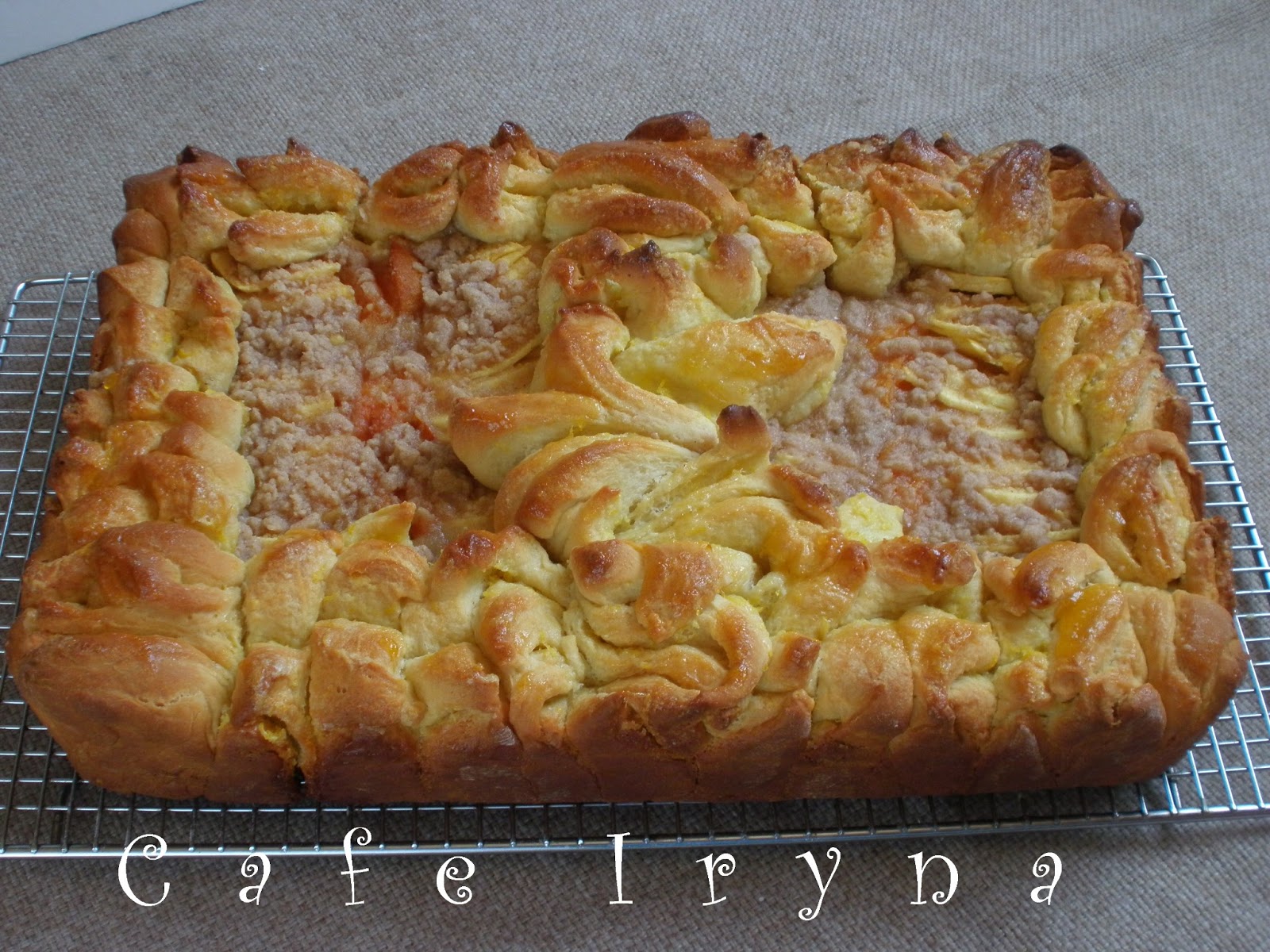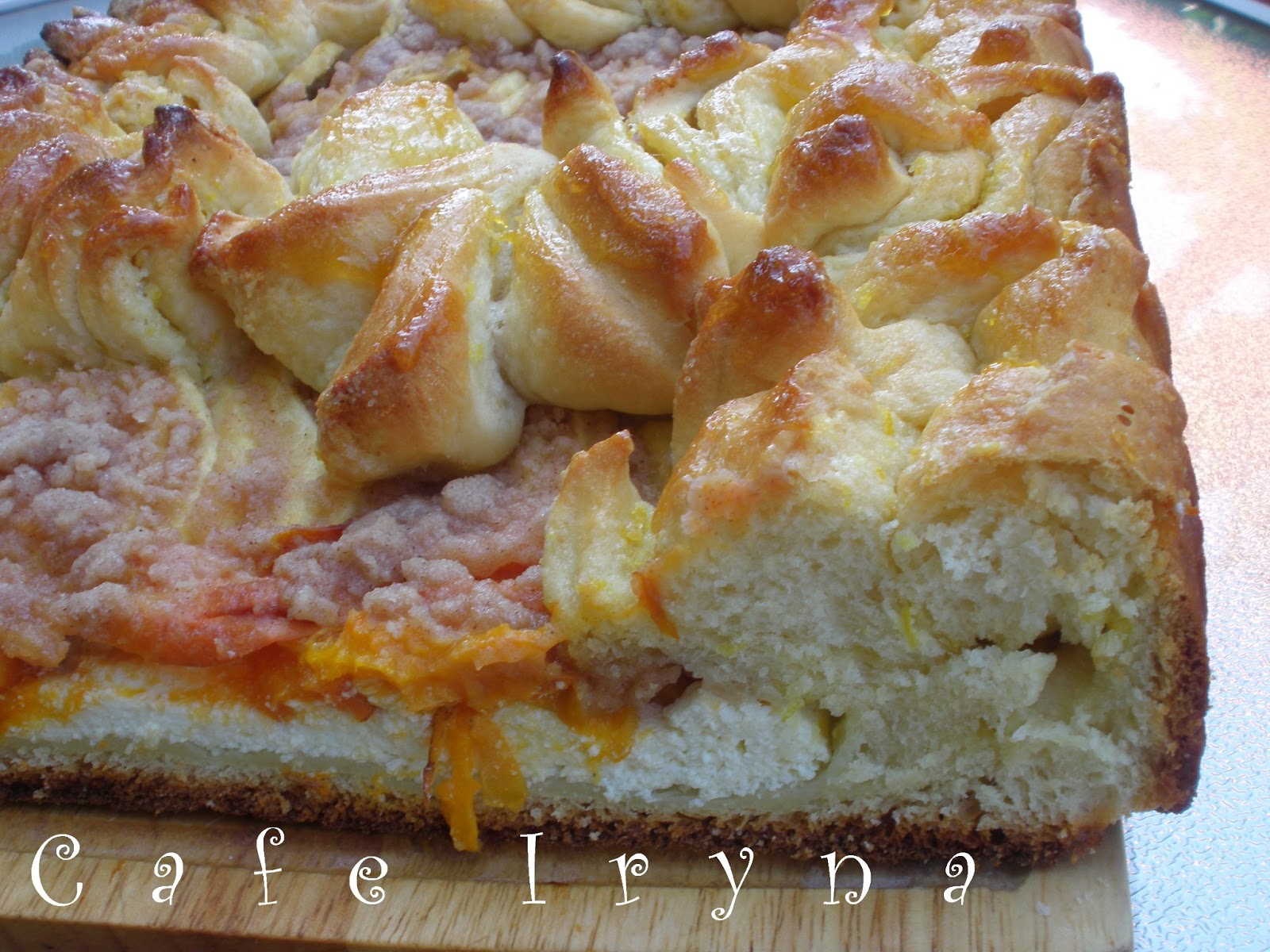 На подложке лежит творожная начинка,ее покрывают яблоки и абрикосы,посыпанные коричным штрейзелем.
