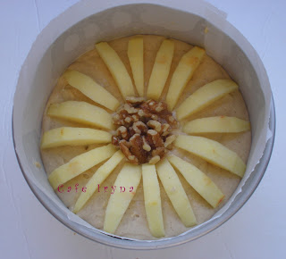 Выложить дольки поверх смеси по кругу,в центр выложить орехи