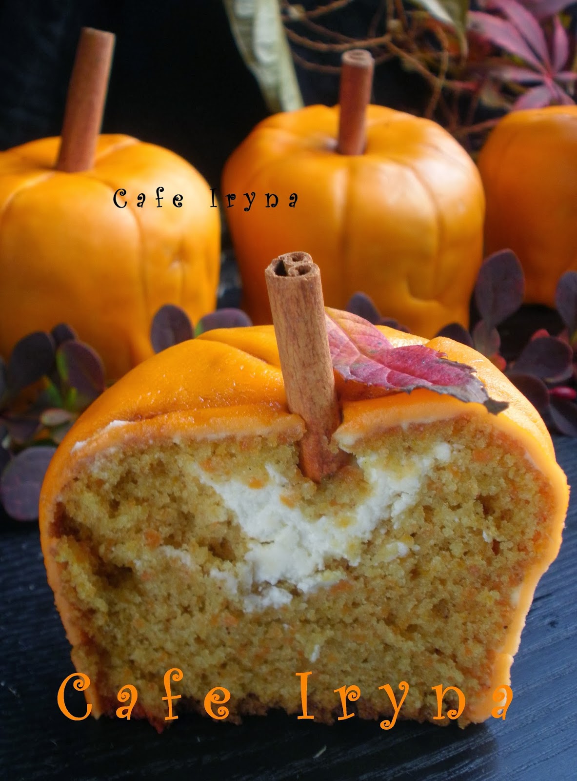 Покрыть маффины мастикой,сделать полоски,иммитирующие поверхность тыквы,воткнуть в центр половинки палочек корицы