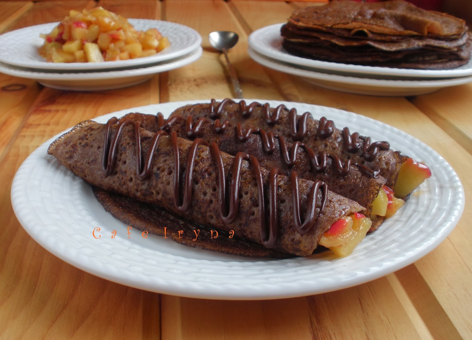 Блинчики с выраженным вкусом шоколада,жареные со специями яблоки и шоколадная поливка-наверняка не оставят равнодушными любителей сладкого…