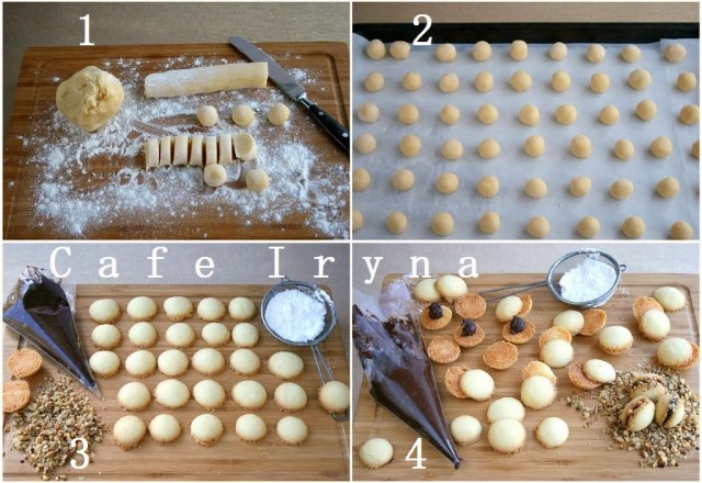 На половинку печенья выдавить немного начинки,накрыть второй половинкой