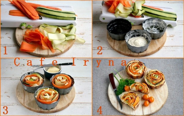 Готовим спирали из моркови и цуккини,формируем на ладони,затем,аккуратно вставить в формы,чуть прижав