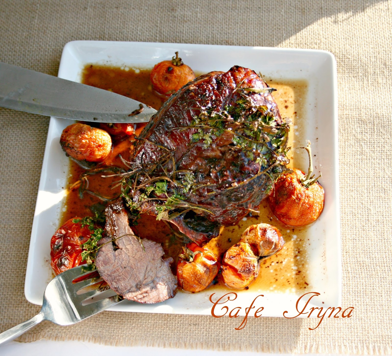 Готовое мясо выложить на блюдо,снять шпагат,нарезать на порции и -наслаждайтесь!