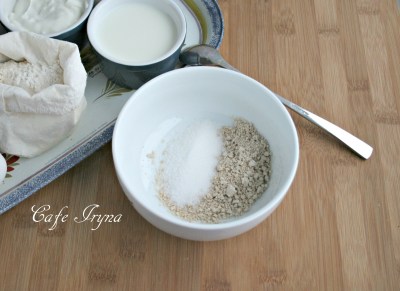 В комбайн просеять половину муки,добавить опару.яйцо,2 столовые ложки сахара,соль и йогурт