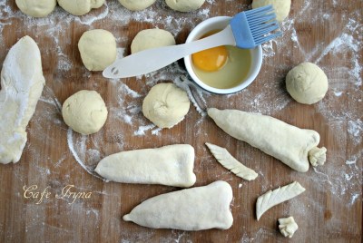 Хвостики нарезать из теста и прикрепить,смазав яичным белком
