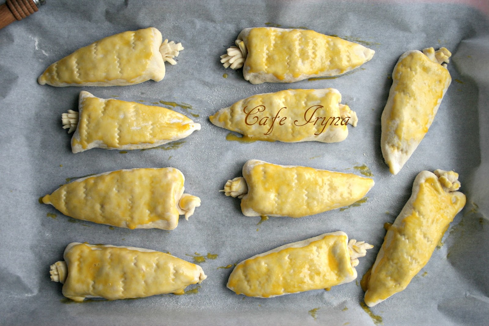 Выложить пирожки на лист,смазать желтком и и сделать насечки резаком,отставить на 15 минут