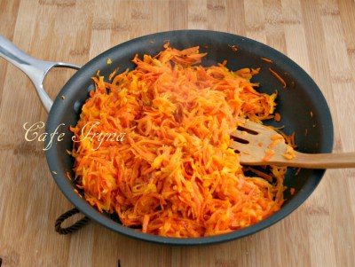 В нагретую сковороду выложить масло,морковь и яблоко