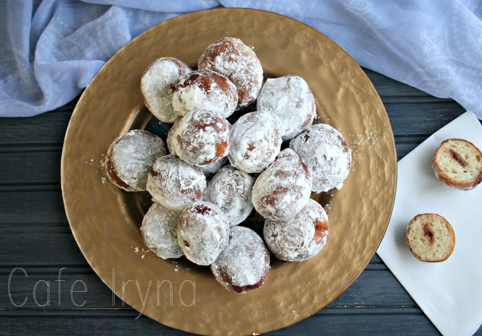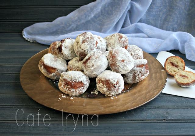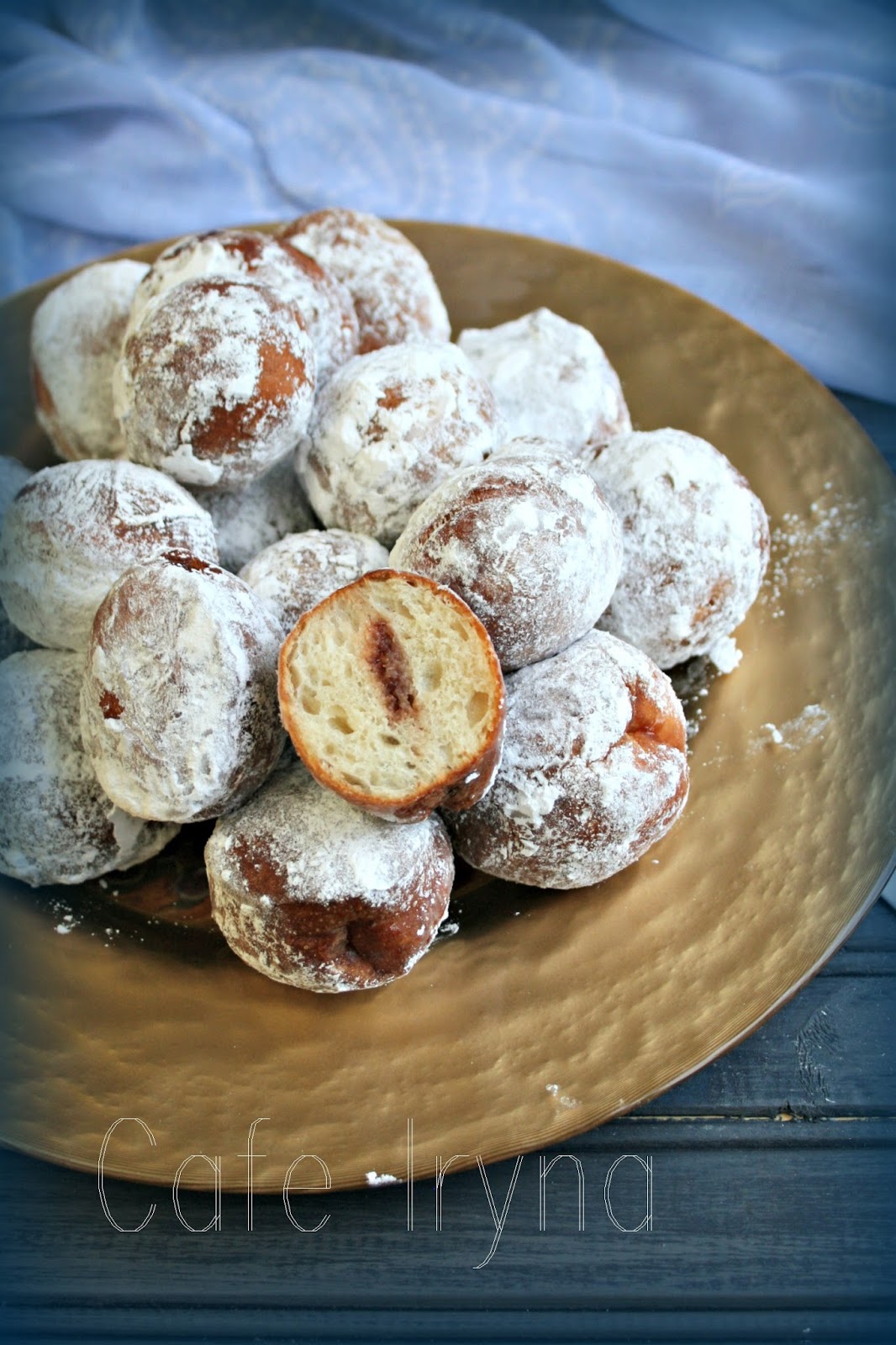 Теплые пончики заполнить начинкой,обвалять в сахаре или пудре