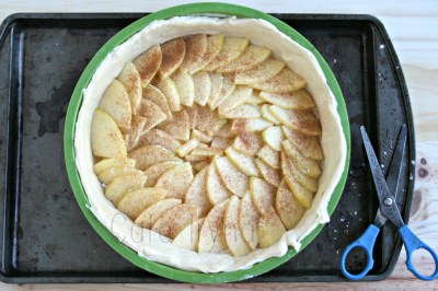 Раскатать вторую часть теста и сделать сеточку,выложить на яблоки,обрезать лишнее тесто,прижать тесто по краю