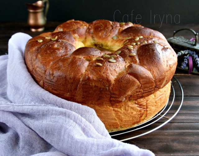 Бриошь смазать смесью желтка и молока дважды,посыпать тыквенными семечками(по желанию)