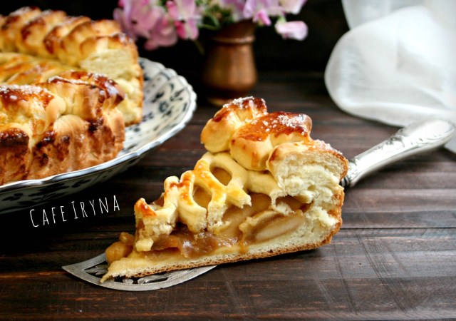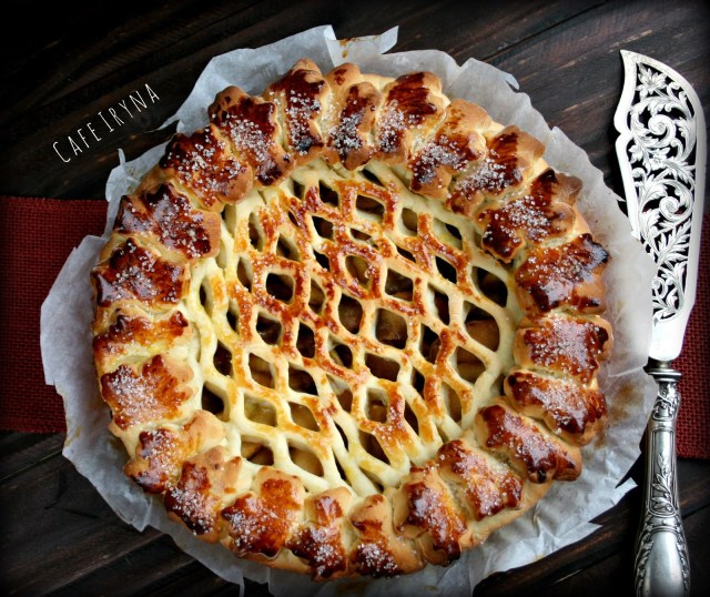 Сегодня у меня «яблочное» настроение,поэтому-пирог с карамельными яблоками.Поверх яблок положила сеточку и украсила ободком.Заходите на чаек!