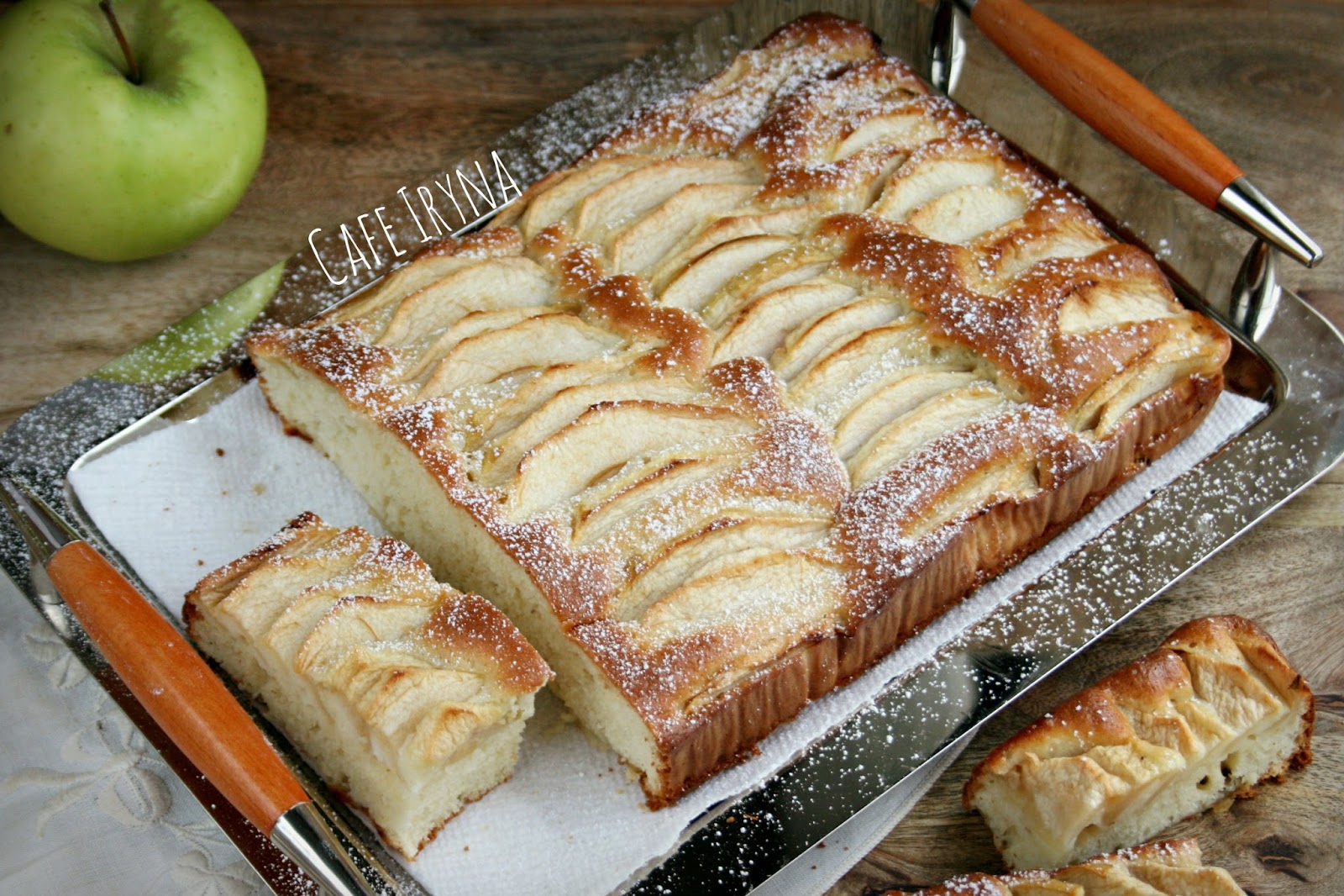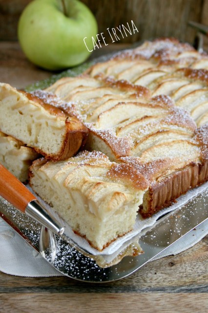 Выложить на дно формы дольки одного яблока(плоско),залить тестом