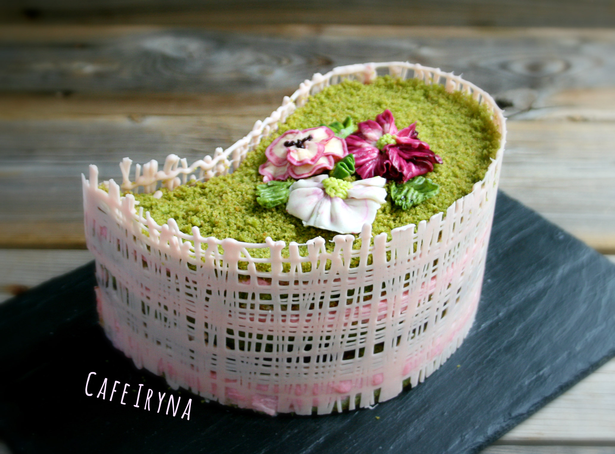 Снять форму,пленку,обернуть шоколадной лентой,верх посыпать крошкой